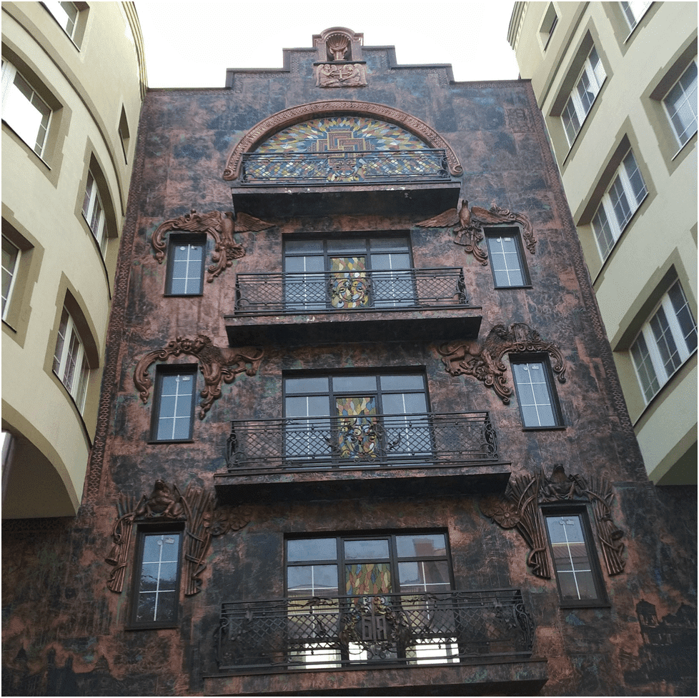 Городской стиль здания, характерный красивыми резными украшениями фасада, прямолинейностью и изяществом форм, а также декоративными элементами на углах, станет отличным фоном для фотографий.