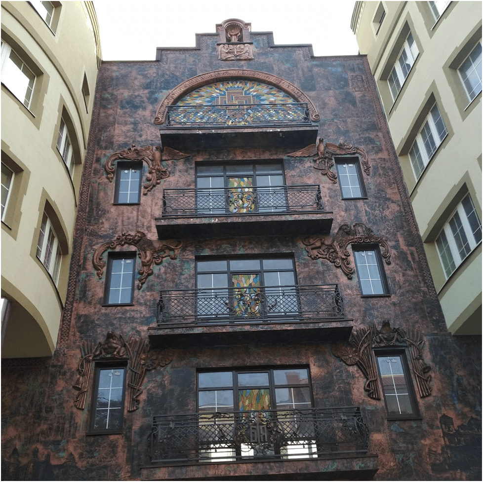 Будинок на вулиці Січових Стрільців дуже вирізняється в загальній архітектурній стилістиці міста. «Це ─ будинок життя», ─ так його назвав автор скульптур, член Спілки художників України Володимир Довбенюк. Будівля вражає перехожих своїм незвичним загадковим фасадом, який прикрашають знаки, скульптури та символи. Темний колір стін, архітектурні деталі та історичний контекст створюють ідеальну сцену для художніх знімків.
